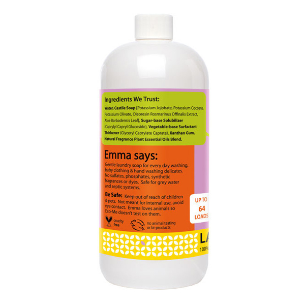 PRODUCT DESCRIPTIONLAUNDRY SOAP: Emma by Eco-Me asked Emma to mix natural ingredients for a safe, effective and gentle laundry soap. What does natural mean to you? For Emma it means pure ingredients save your health and environment by using recycleable, natural soaps so toxins and chemicals stay out of your drains and out of our water supplies. Natural cleaning product based on simple household ingredients and pure plant oils. Premixed Cleaning Product, Ready to use. Emma loves animals, so Eco-Me doesn't test on them.